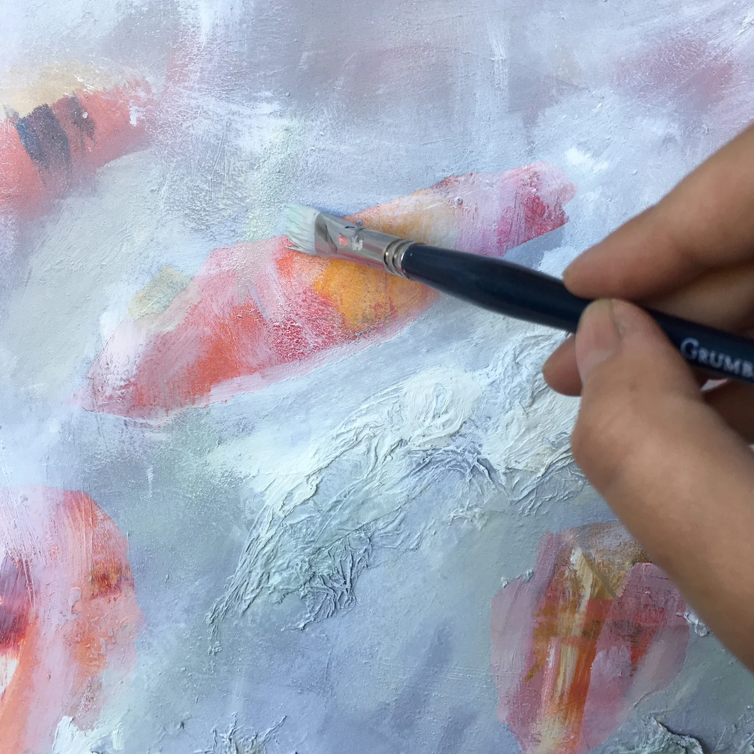 New oil painting of a large floating orange red object that glows from within, levitating sideways before dividing into equal size sister cells. Work in progress, drying now.